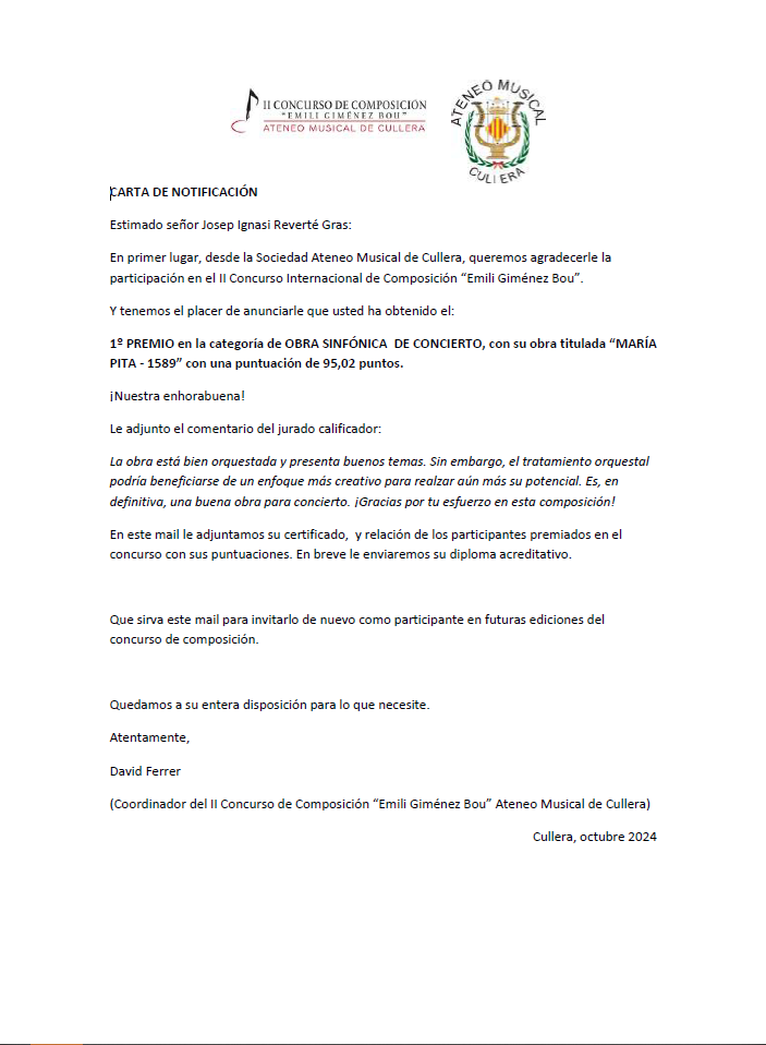 El compositor Ignasi Reverté, que participó con la obra «María Pita – 1589» en la categoría de obra sinfónica para banda, obtuvo una puntuación por part del jurado especialista de 95,02 puntos, cosa que le mereció el primer premio en el concurso